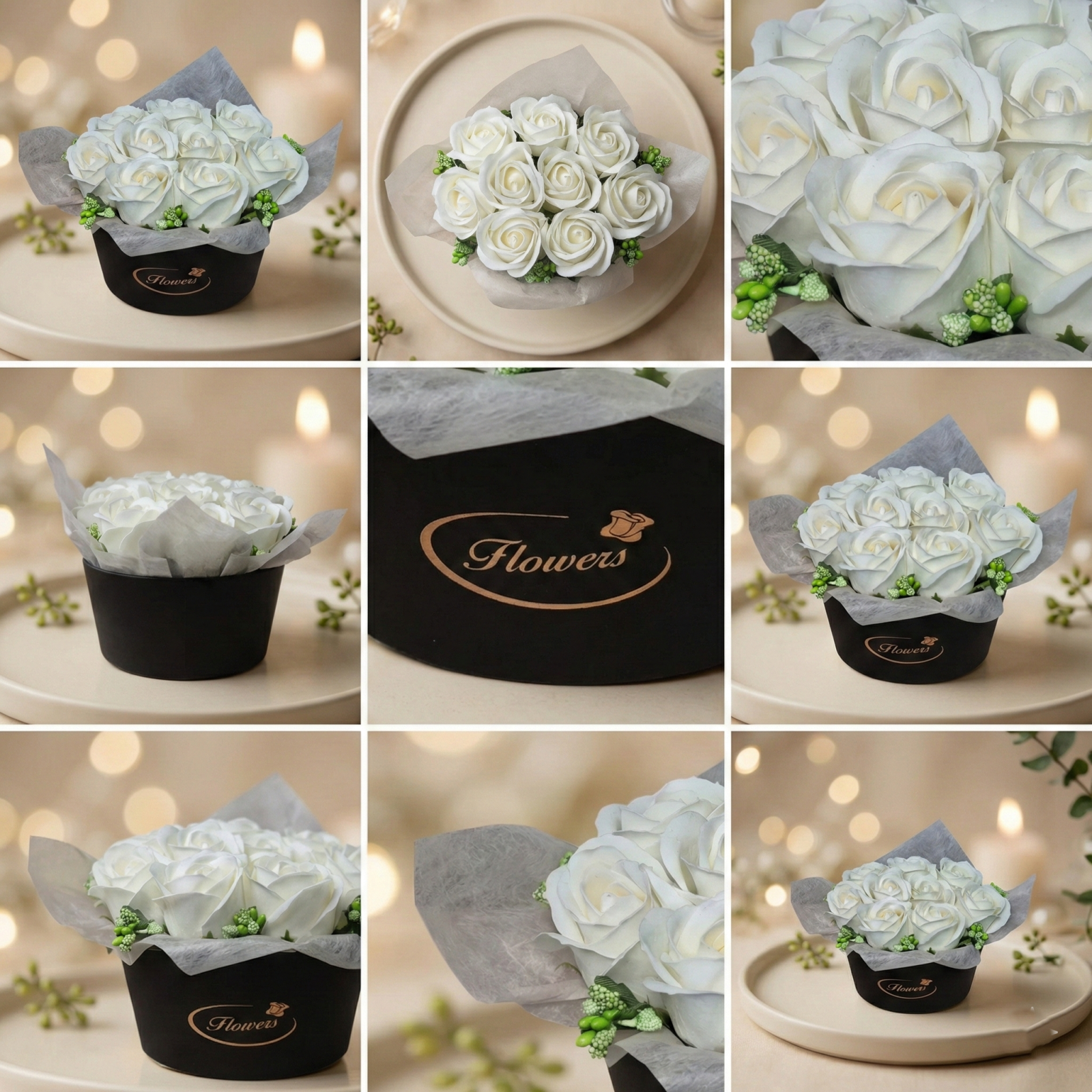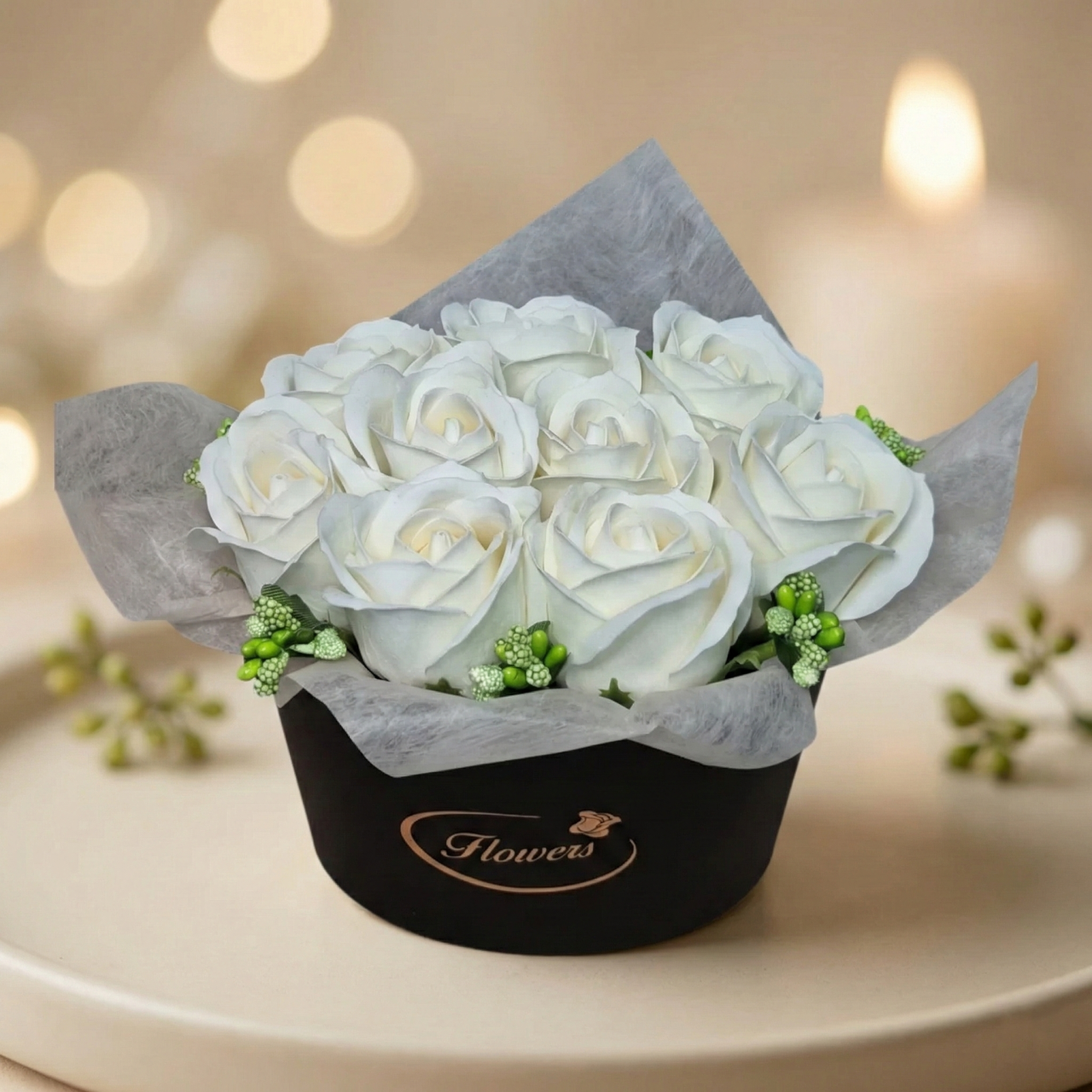 Eternal White –Cadou Aranjament 9 trandafiri sapun albi