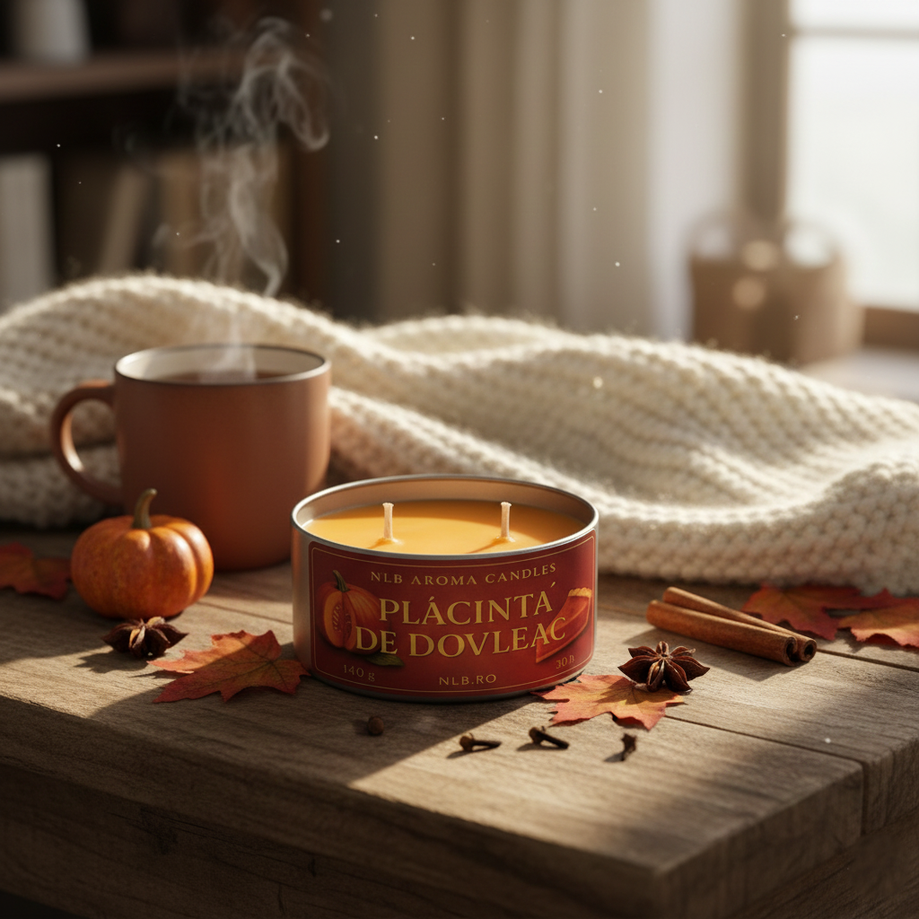 Redescoperă farmecul zilelor de toamnă cu lumânarea parfumată NLB AROMA CANDLES, cu aromă autentică de plăcintă cu dovleac. Această lumânare de 140g, prezentată într-o cutie metalică elegantă, este mai mult decât un obiect decorativ; este o experiență senzorială creată cu responsabilitate și grijă pentru mediul înconjurător.